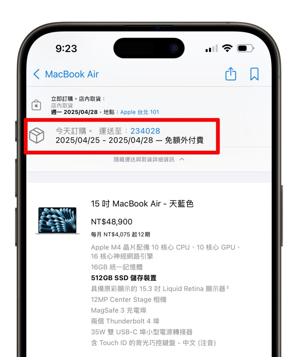 现在已经可到苹果线上商店订购 M4 MacBook Air,不过到货时间会根据你的选配项目而有不同,最快的到货时间抓在 4/25 ~ 4/28,提醒大家在选配完之后可以稍微留意一下到货时间。