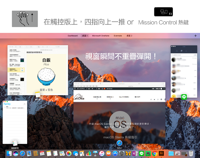 一般我们用的Mac都是笔记本款,像是MacBook、MacBook Air、MacBook Pro,很可惜前面两者的尺寸都只有11–13寸,就算是MacBook Pro也只有到15寸,在这么小屏幕空间中我们开几个网页啊、聊个桌面版的LINE,挖哩勒… 窗口就塞爆屏幕了! 若你买不起第二个屏幕做外接,或是换成大台的 iMac 怎么办? 今天介绍你一个重要的系统功能,macOS 上最棒的窗口/桌面管理方式:Mission Control。
