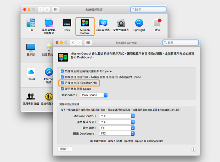 所以我建议把 Mission Control 窗口改成「分组」的方式排列,在「系统偏好设置」→「Mission Control」,勾选「依据应用程序将窗口分组」: