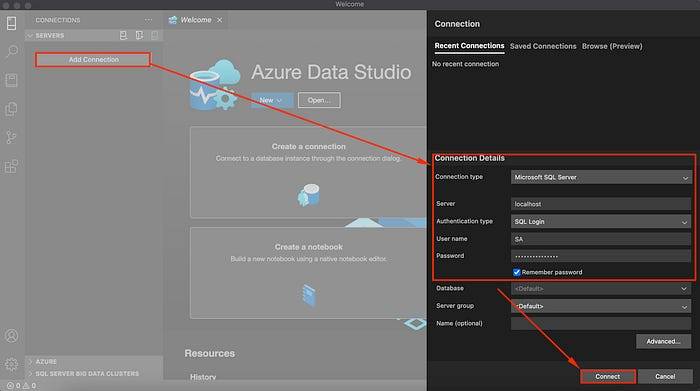 首次开启Azure Data Studio,点击左侧的「新增连线」,然后依下图输入连线信息与刚才在step 2.2中设置的密码,按下连线。