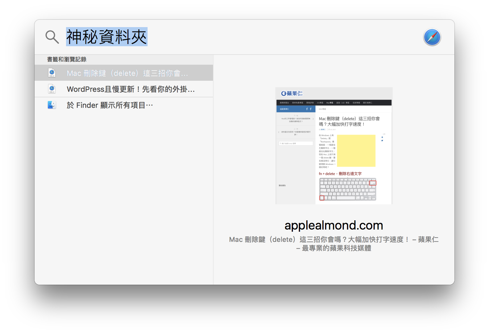 之前的文章有介绍过 Spotlight 强大的功能,可以做简单的计算、单位换算,以及他的老本行搜索文件等等。 可是如果你有文件不想被搜寻到又该怎么办呢? 像是在做简报时,一在 spotlight 输入 .avi 就发现一堆很不妥当的文件,非常尴尬。 这边就教大家如何隐藏特定文件/文件夹,避免被 Spotlight 搜索到。