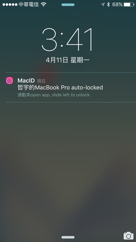 打开电脑后,iPhone 会出现右图的通知,滑动就直接进入 MacID App,并用 TouchID 解锁。