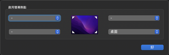 2. 预览桌面:当鼠标移到屏幕右下角时显示桌面 (设置方法:系统偏好设置 > 指挥中心 > 热点)
