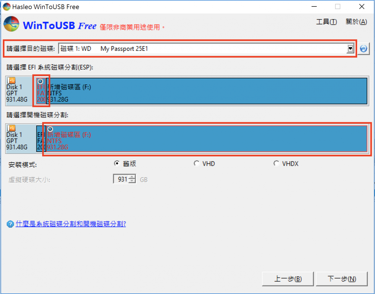 目的磁盘的部分选择我们要安装到的外接硬盘,选择完后将下面两个磁盘分割的选项圈选,选完后按下一步。