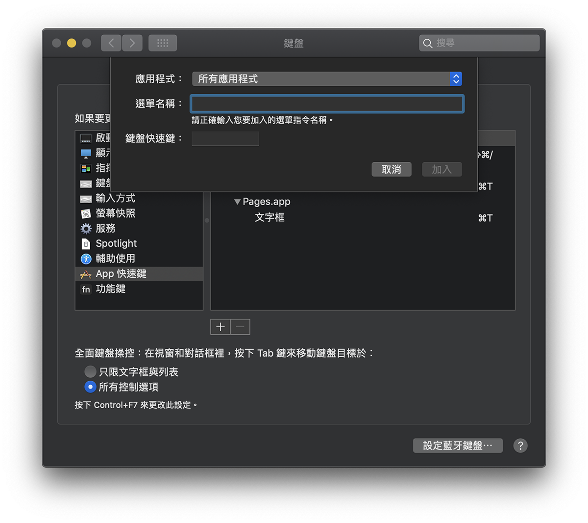 也就是说,只要是在菜单中出现的功能,都可以用这方法指定一个快捷键给他; 这边再举一个例子,假设我要在 Pages 里面设置「文字框」这功能的快捷键。