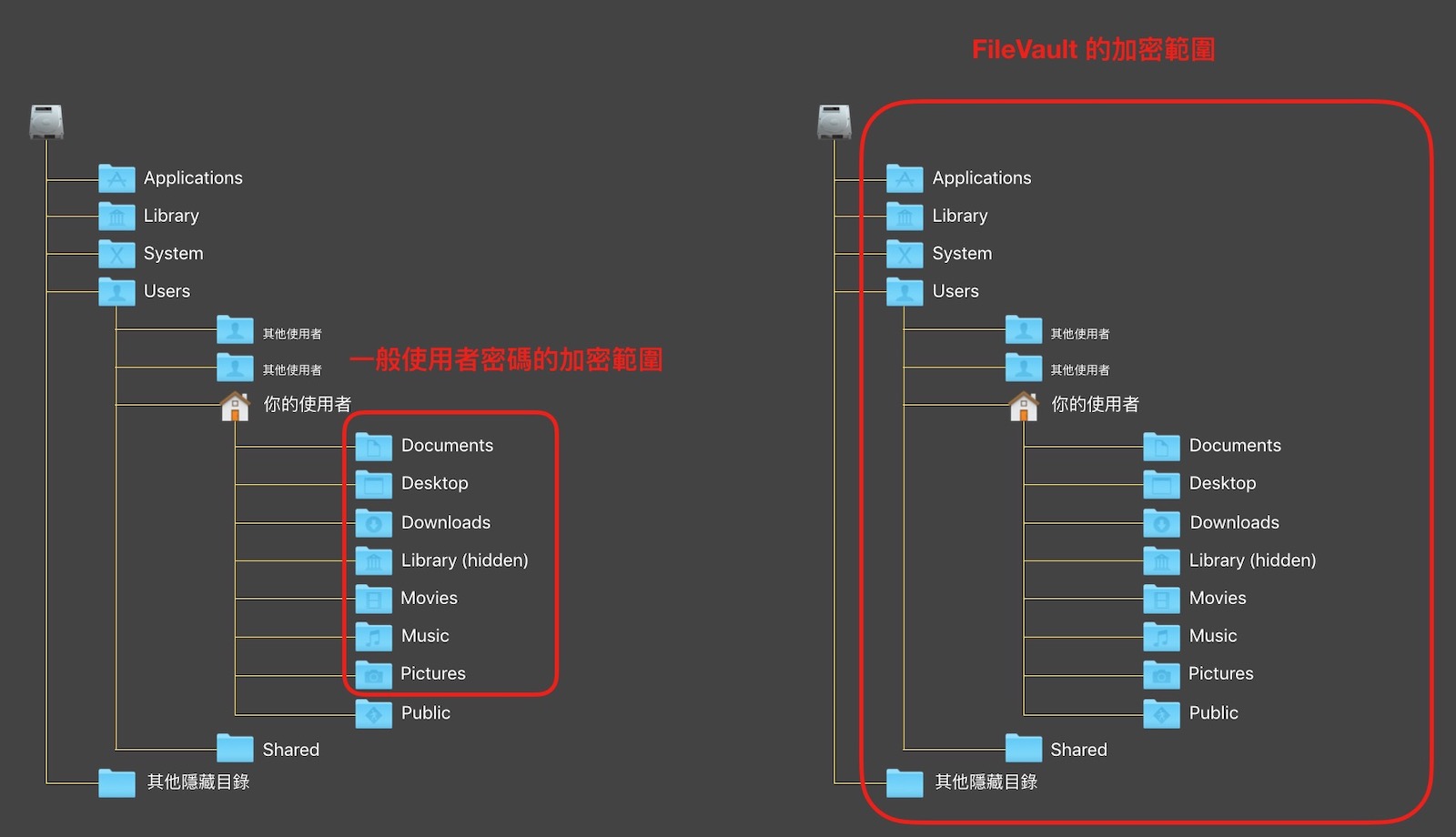▼ 从下图可以看到,如果只是用户的密码,你保护的范围只有默认家目录底下的资料而已,其他的通通都是可以轻易得到的。 而 FileVault 就不同了,他是整颗硬盘加密,所以最重要的根目录的 Library 资源库,自然也在加密范围之内。