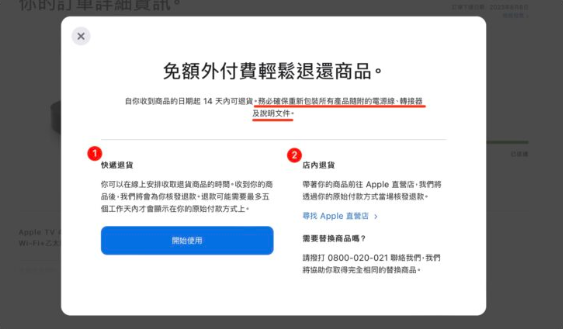 接着你会看到一个提醒的信息,告诉你如果在Apple 官网买的商品要退货的话,包装盒、说明书、充电线….等配件都要留着。