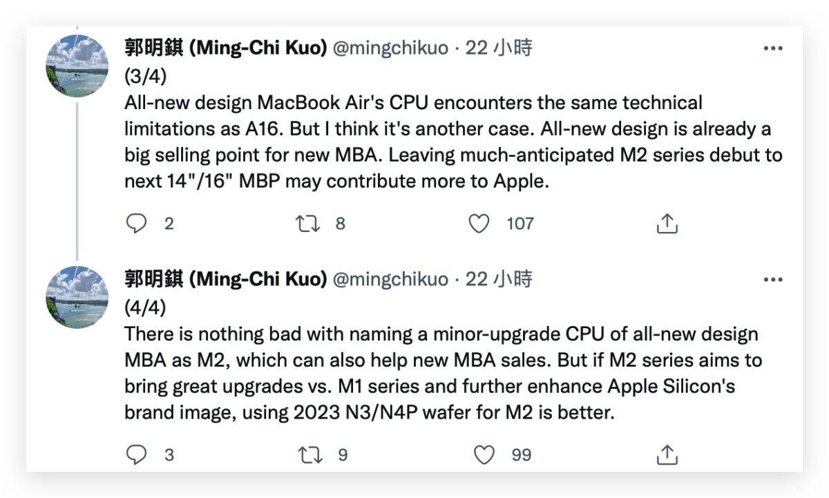郭明錤:MacBook Air 将不会用上 M2 芯片