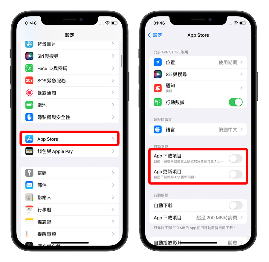 你可以从「设置」→「App Store」的功能中将「App 下载项目」、「App 更新项目」关闭。