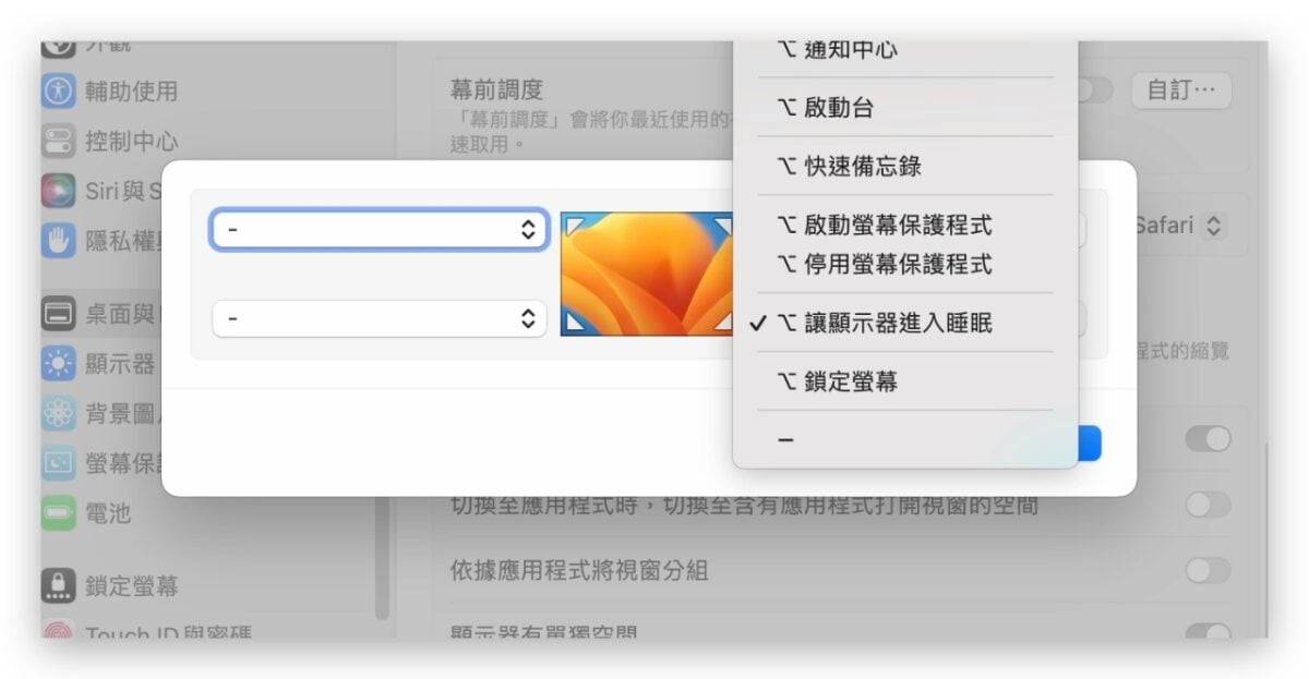 点开以后会看到画面上有一个屏幕,然后四个角都有下拉菜单,这就是对应到你 Mac 屏幕上四个角的功能,当你设置完成以后把鼠标移到任一个有设置热点的角落,就会执行对应的功能。