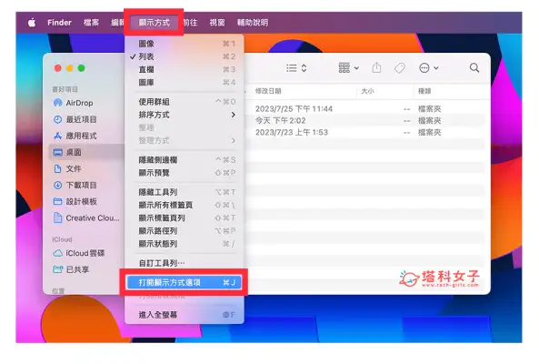 要显示资料夹大小的话,请按键盘快捷键 Command + J,或是点一下上方选单列的「显示方式」>「打开显示方式选项」。