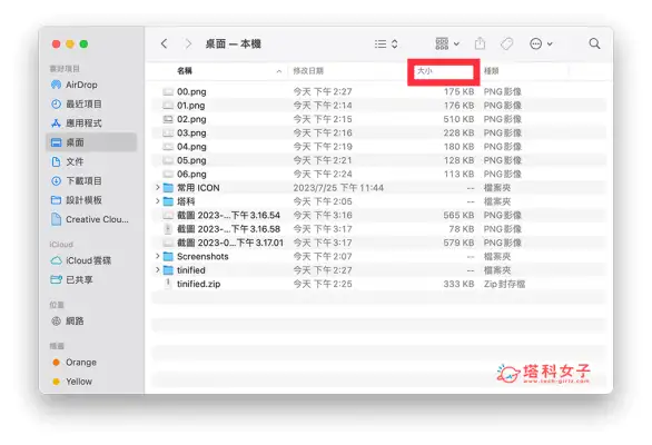 首先,请开启 Mac 上的 Finder,点进桌面、文件、下载项目或其他位置,先将上方工具列的显示方式改成「列表」。然后在「名称」栏位按右键,并在跳出来的小选单中勾选「大小」选项,